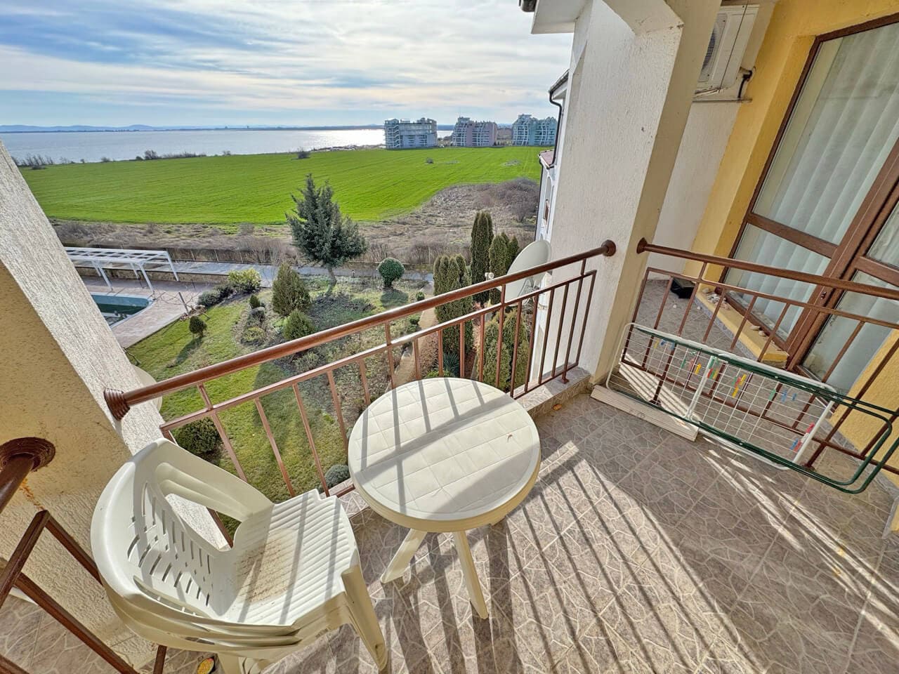 Квартира расположена на 4 этаже пятиэтажного здания в комплексе «Рутланд Бич» в Равде. Высота даёт два преимущества: ощущение пространства и стабильный вид. Панораму не перекрывает соседний корпус — перед террасой бассейн комплекса, дальше открытая линия горизонта и море.