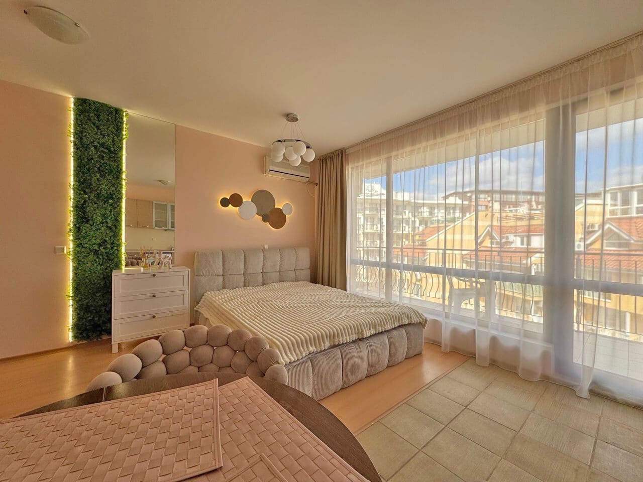 Общая площадь составляет 40 м². Планировка начинается с небольшого коридора при входе, который логично отделяет жилую зону от санузла. Основное пространство объединяет кухню, столовую и зону отдыха. Кухонный блок размещён вдоль стены, остаётся место для обеденного стола и полноценной кровати. Большие окна и выход на террасу делают помещение светлым. С террасы открывается вид на курортную часть Солнечного берега и соседнюю застройку — формат, который даёт ощущение открытого пространства без близкого «окна в окно» ☀️.