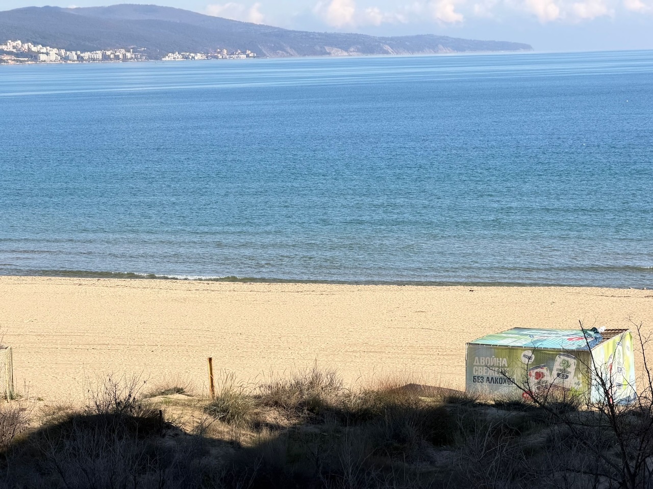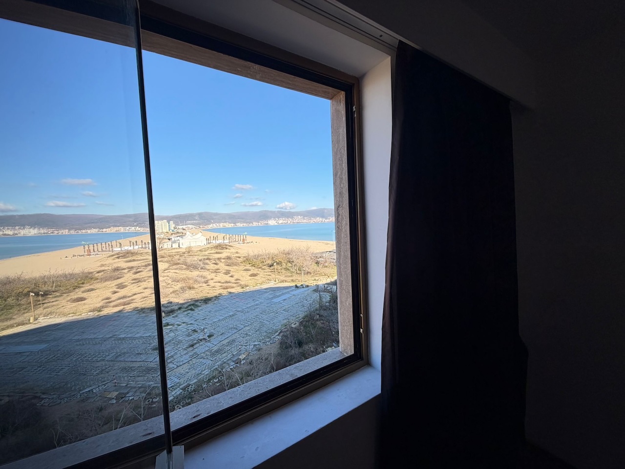 Апартамент общей площадью 89,69 м² находится на пятом этаже восьмиэтажного здания комплекса Golden Rainbow VIP Residence в южной части курорта Sunny Beach. Комплекс расположен непосредственно у береговой линии рядом с песчаным пляжем Cacao Beach. Из окон и с террасы открывается панорама морского залива и побережья в направлении Несебра.