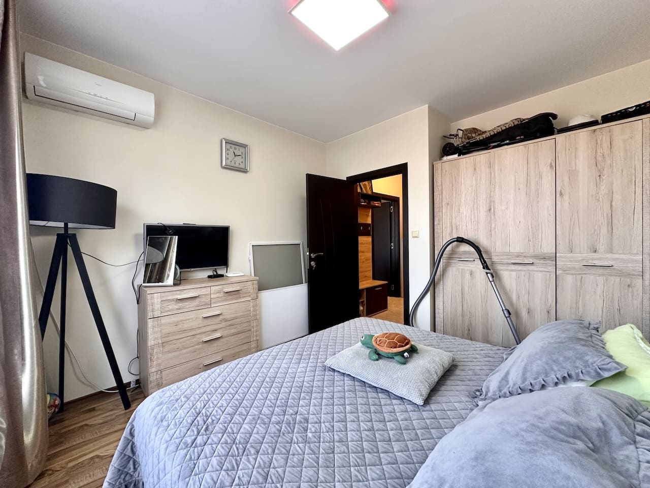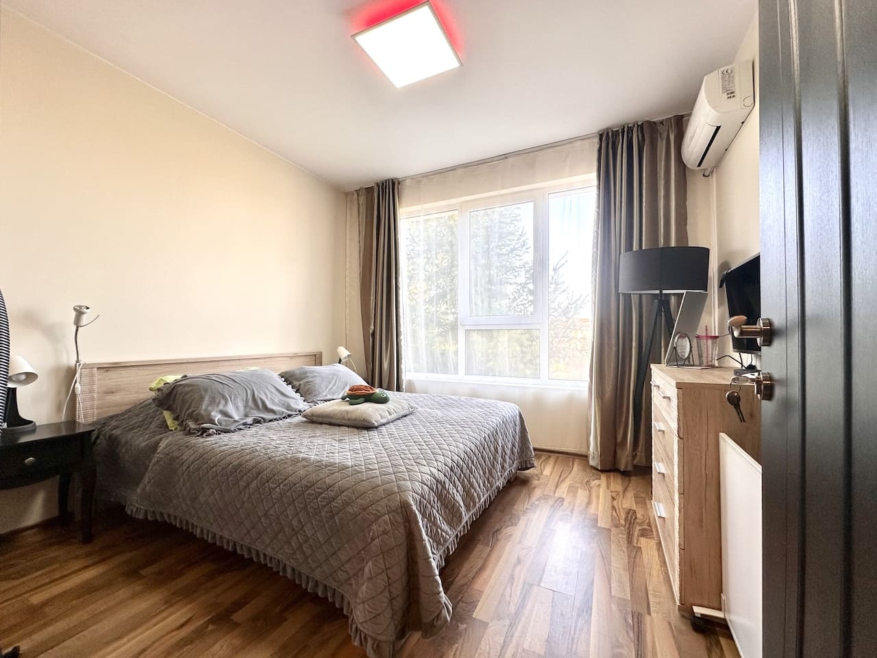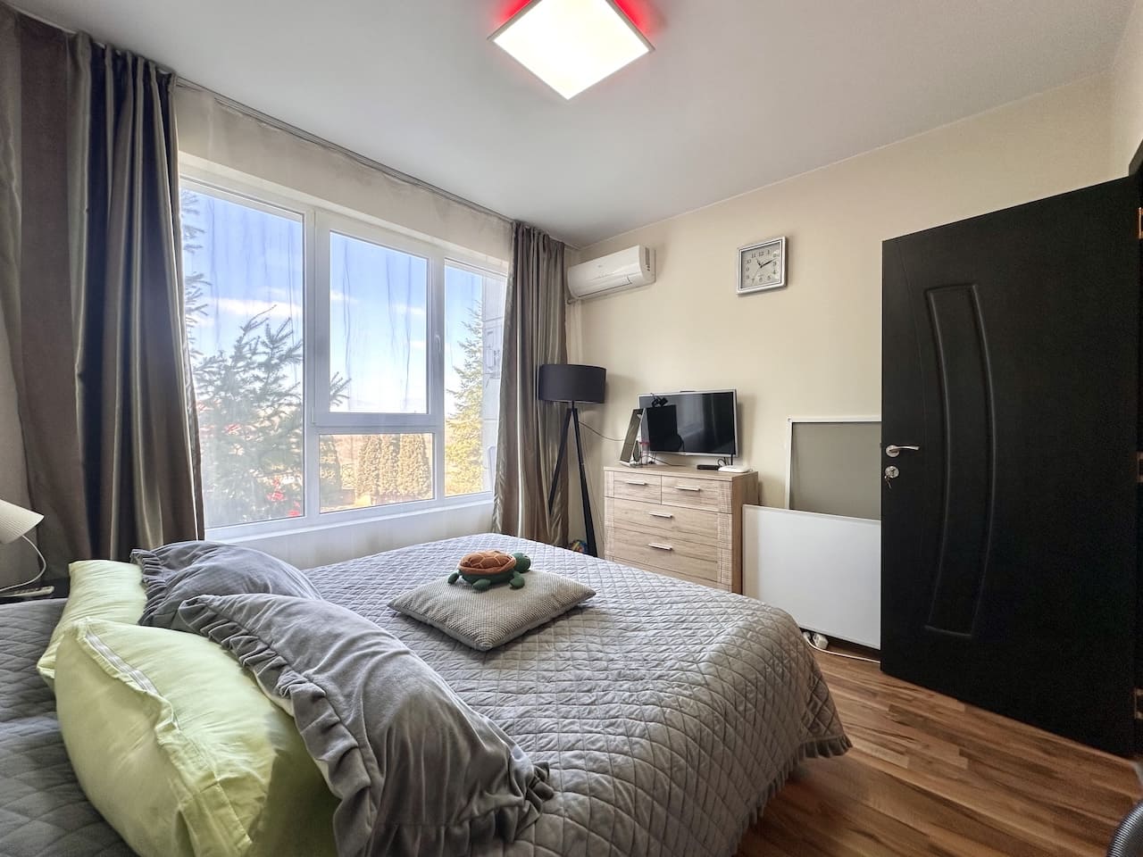 Спальная комната изолирована от гостиной. В ней установлены двуспальная кровать, шкаф для хранения вещей и кондиционер. Большие окна обеспечивают хорошее естественное освещение.